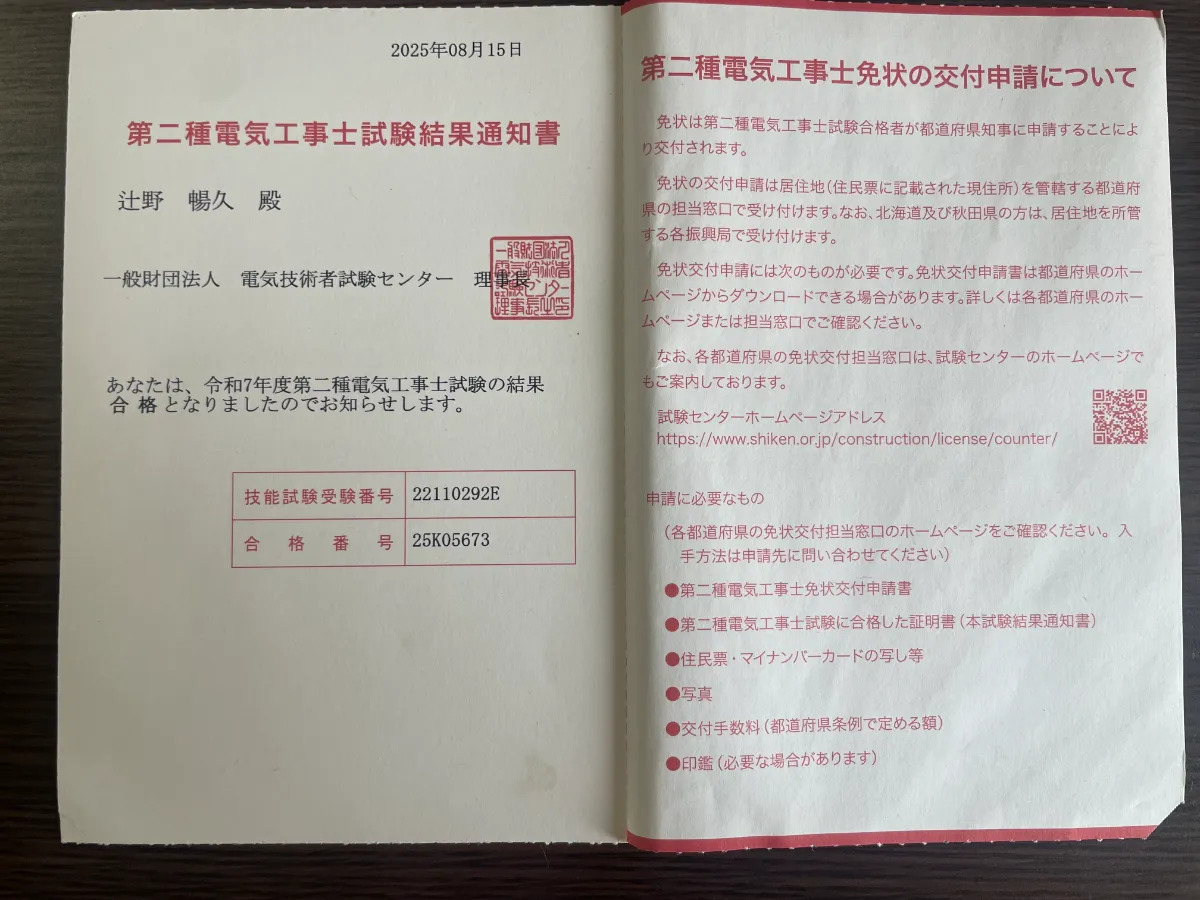 本日は、私たちにとって嬉しいご報告があります。 この9月に実施された「第二種電気工事士」の国家試験に無事合格しました!